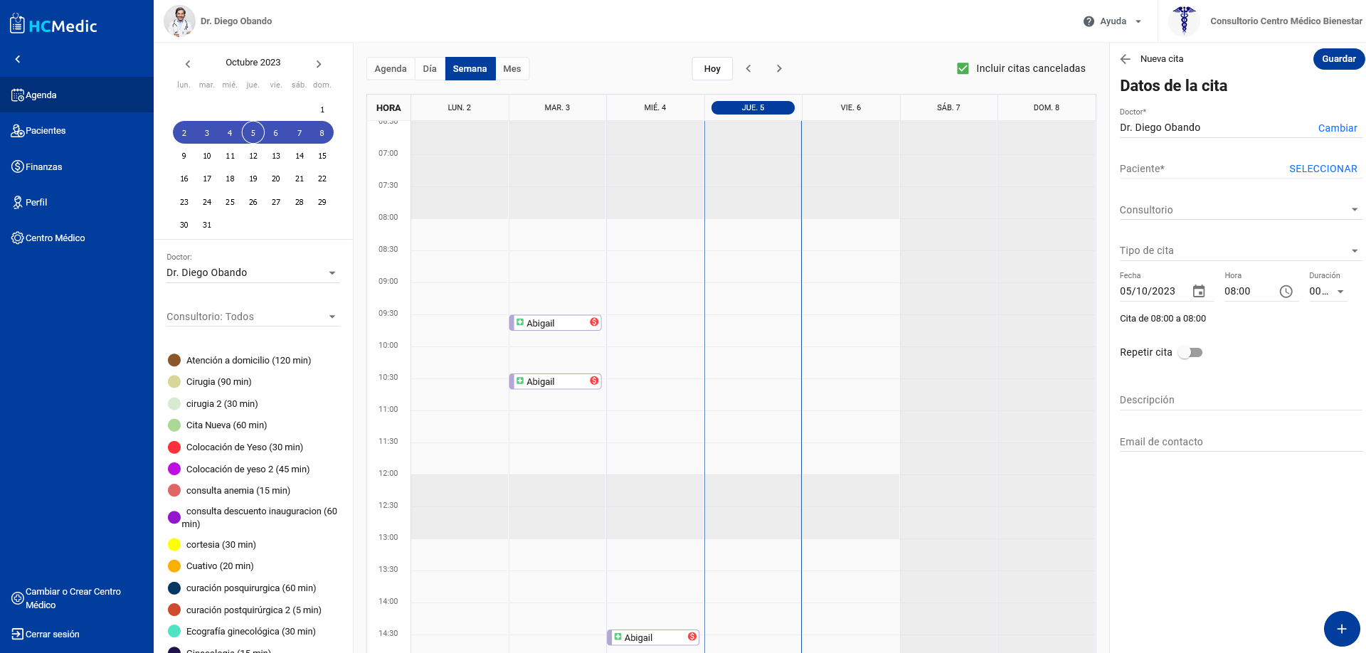 - Haga click en Agenda, y luego sobre unas de las casillas blancas, y en el menú de la derecha, llene la información de la cita. No olvide incluir el e-mail de su paciente para que HCMedic App envíe un correo informativo y un correo recordatorio a su paciente, un día antes de su cita: