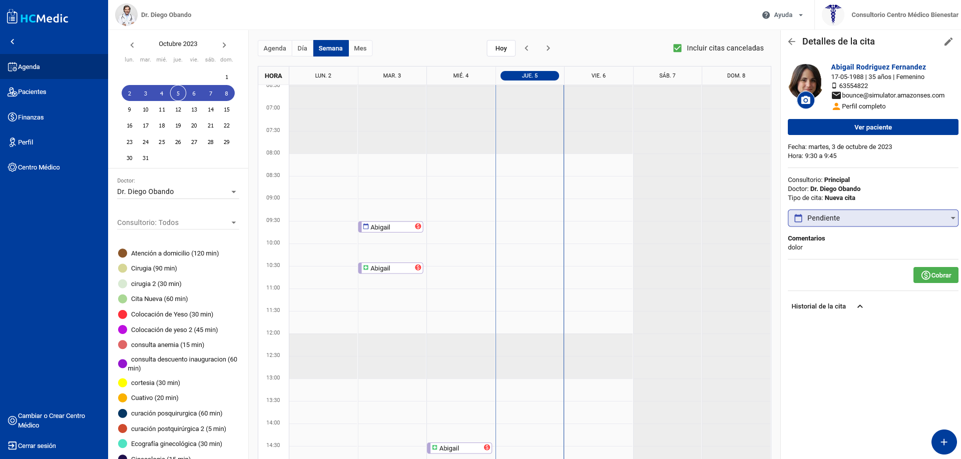 La agenda de HCMedic App proporciona una visión clara de la disponibilidad de los médicos y permite la programación de citas de forma rápida y precisa. Además, cuenta con el envío automático de recordatorios de citas para pacientes, lo que ayuda a reducir las ausencias y los retrasos. También, cabe resaltar la seguridad que HCMedic App le ofrece al proteger la información de sus pacientes con el control de usuarios, como también el hecho que sus datos se crean y resguardan en nuestros servidores encriptados.