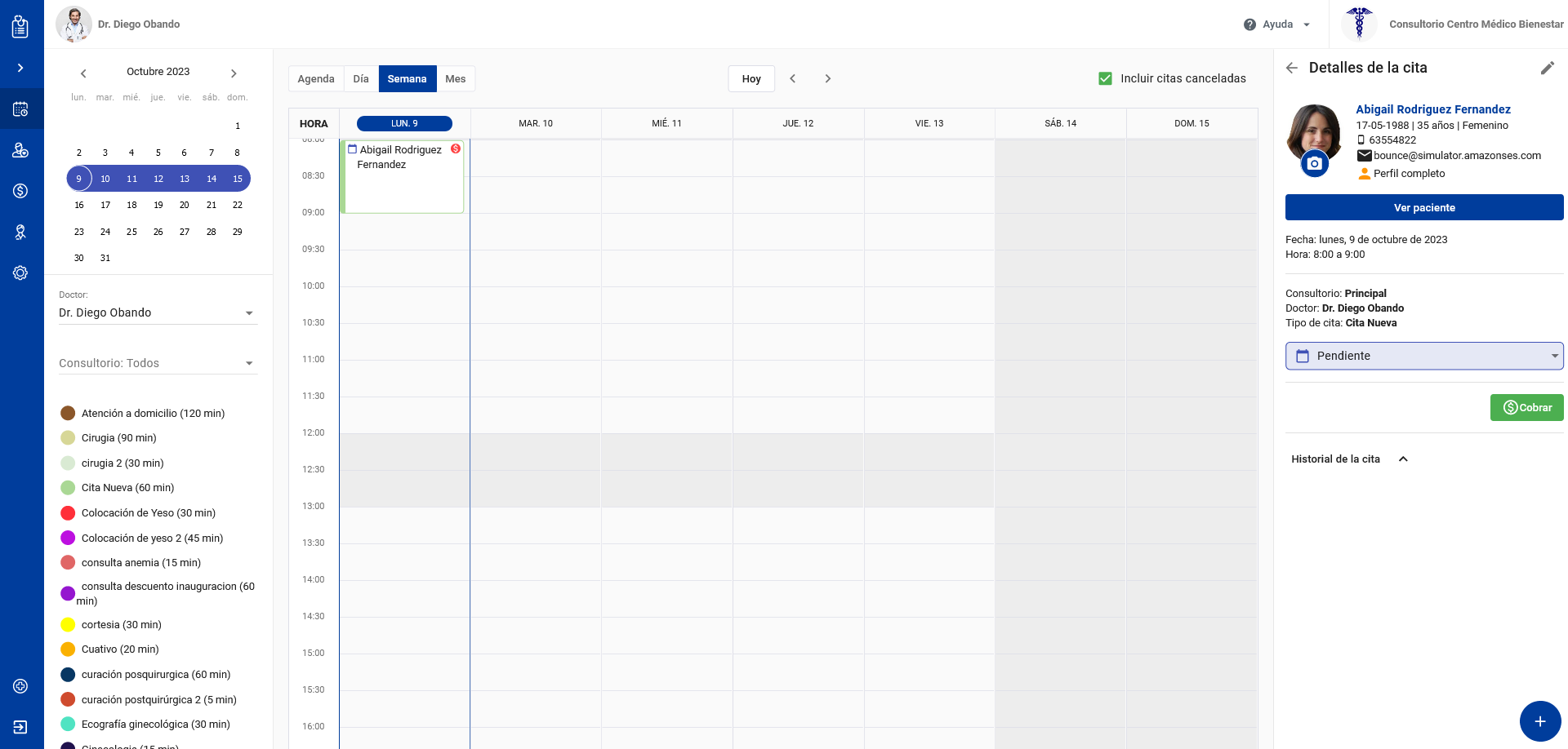 Una vez creados sus códigos de facturación, usted puede registrar un ingreso de muchas formas. Puede añadir desde la herramienta de Finanzas directamente, como también desde Pacientes, o también desde la Agenda, por favor haga click en la cita recién realizada, y luego en Cobrar: