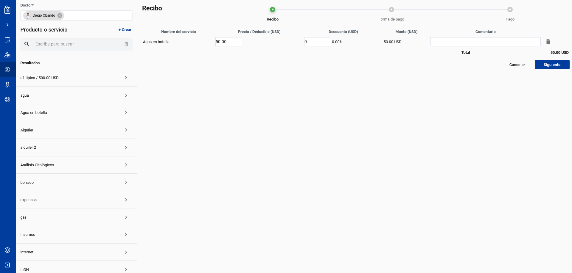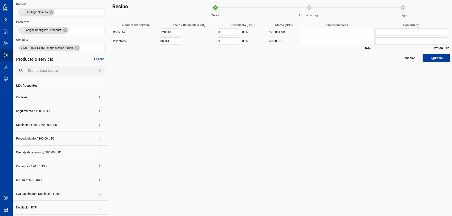 Después, en la pantalla de Recibo, en la parte de Consulta, seleccione la última consulta realizada. HCMedic App incluirá la información de códigos de facturación añadidas por el médico en consulta. También puede añadir otros productos o servicios. Haga click en Siguiente: