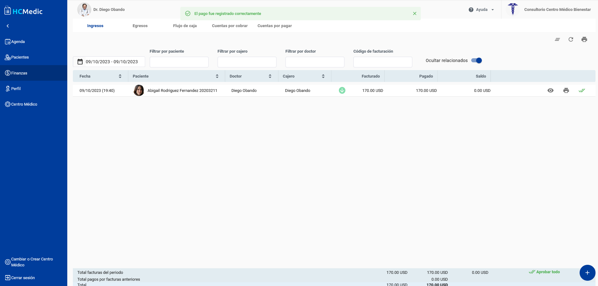 El ingreso se registrará con la fecha y la hora, y quedará disponible en Finanzas > Ingresos. Si lo desea, puede imprimir un recibo. También puede filtrar por rangos de fechas, por paciente, por cajero, por doctor: